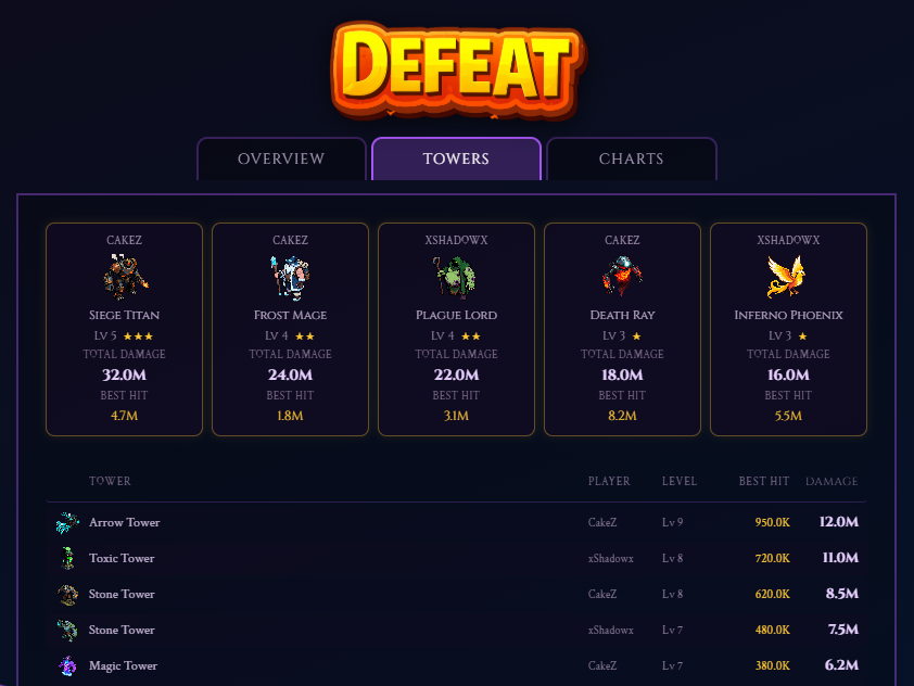 - The end-of-game screen now includes a Towers tab with a grid of tower cards showing type, level, stars, total damage, and peak hit.